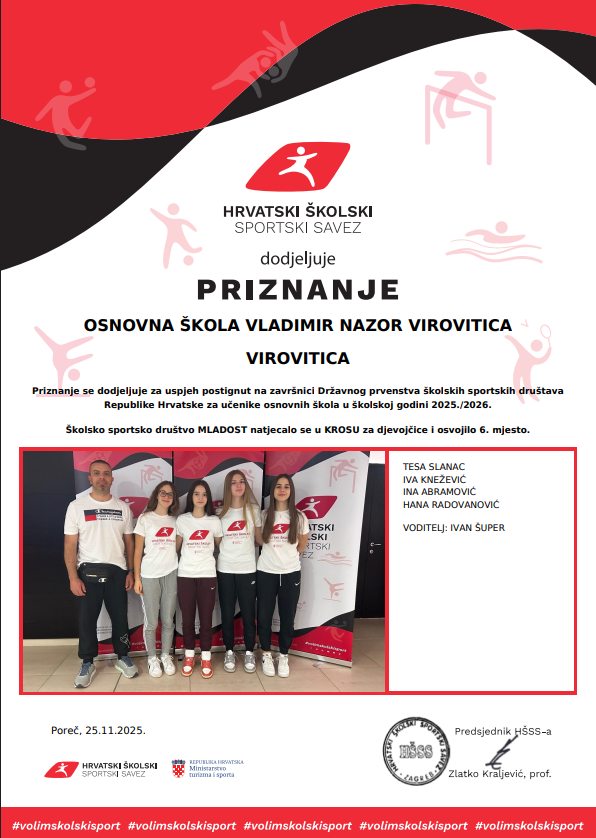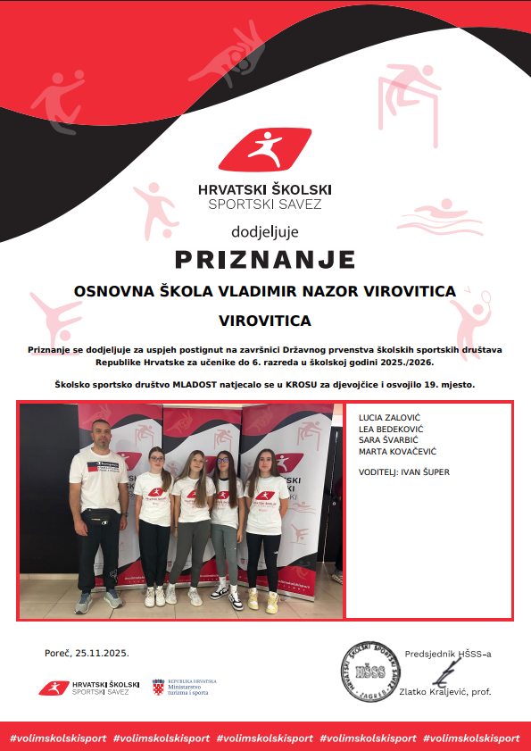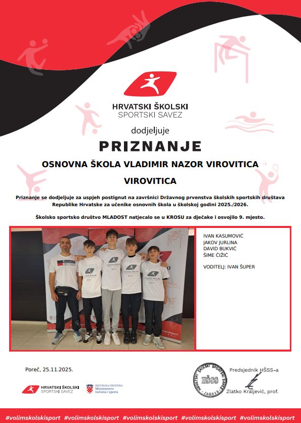 25.11 državno natjecanje u Krosu održano u Poreču. Ove godine su Nazori otovrili sportsku sezonu sa tri prva mjesta na županijskom natjecanju iz Krosa od ukupno četiri kategorije, nikada ranije nismo imali takav jak rezultat na županijskom natjecanju. Tim rezultatom su se plasirali na državno natjecanje, gdje su cure 5-6r bile 19.mjesto, cure 7-8r su bile 6.mjesto, i dečki 7-8r su bili 9.mjesto. Trčali su po kiši na travi i blatu, u teškim uvjetima i borili se za svoju školu