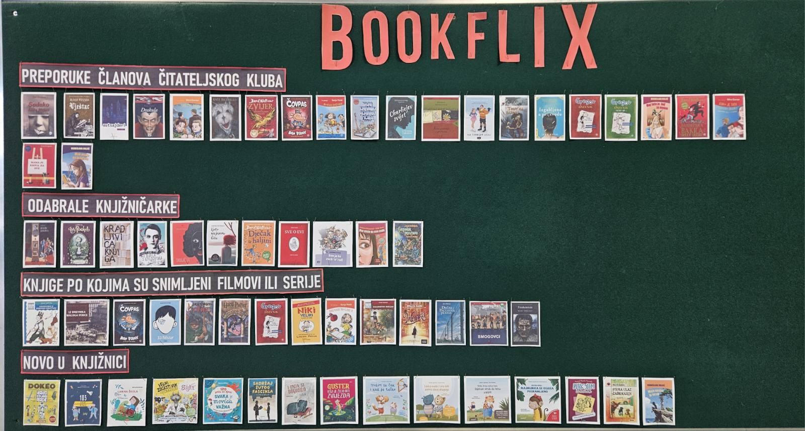 Učenici i knjižničarke kratko su predstavili knjige koje bi preporučili drugima da ih pročitaju, a zatim su osmislili i izradili Bookflix u holu škole. Bookflix sadrži četiri zanimljive kategorije: